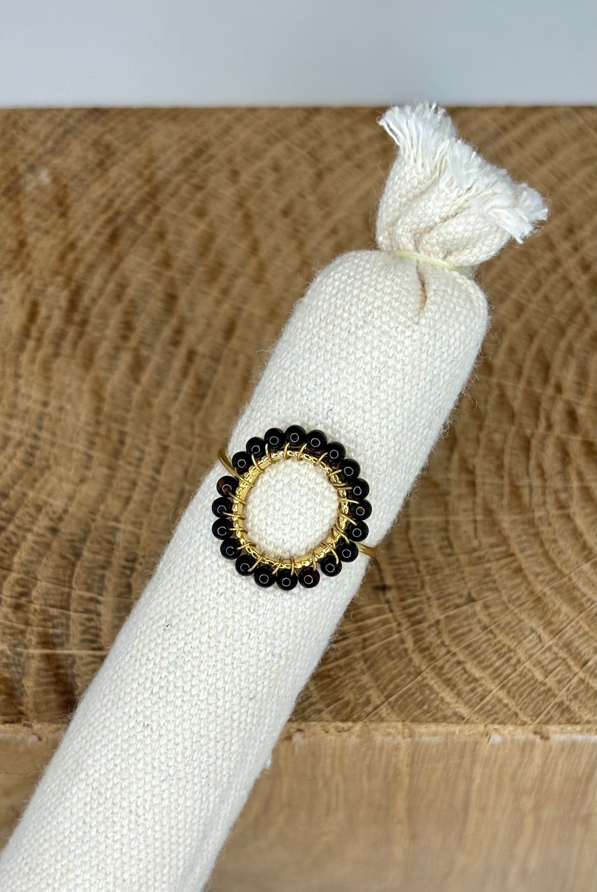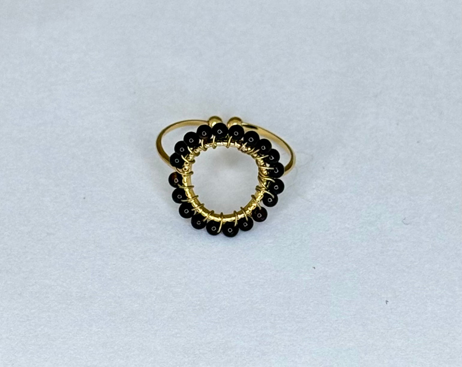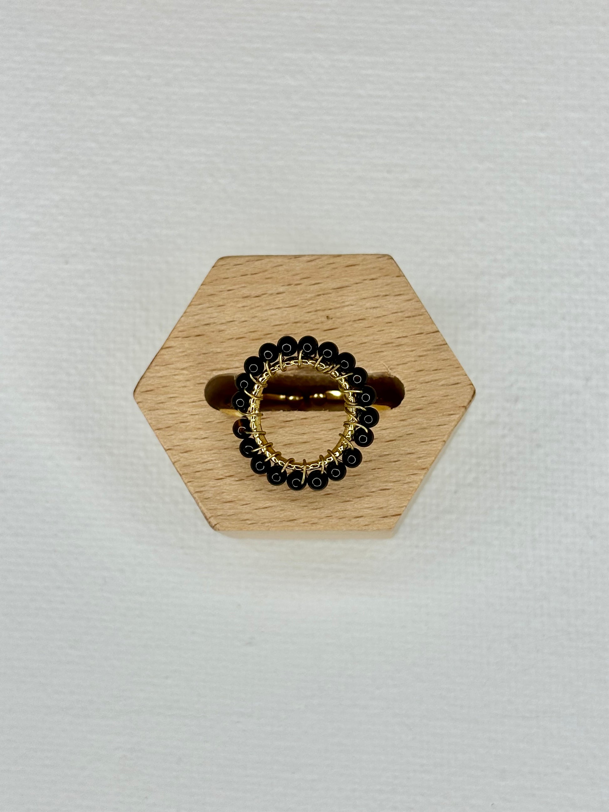 - Bague en acier inoxydable doré et perles noires
