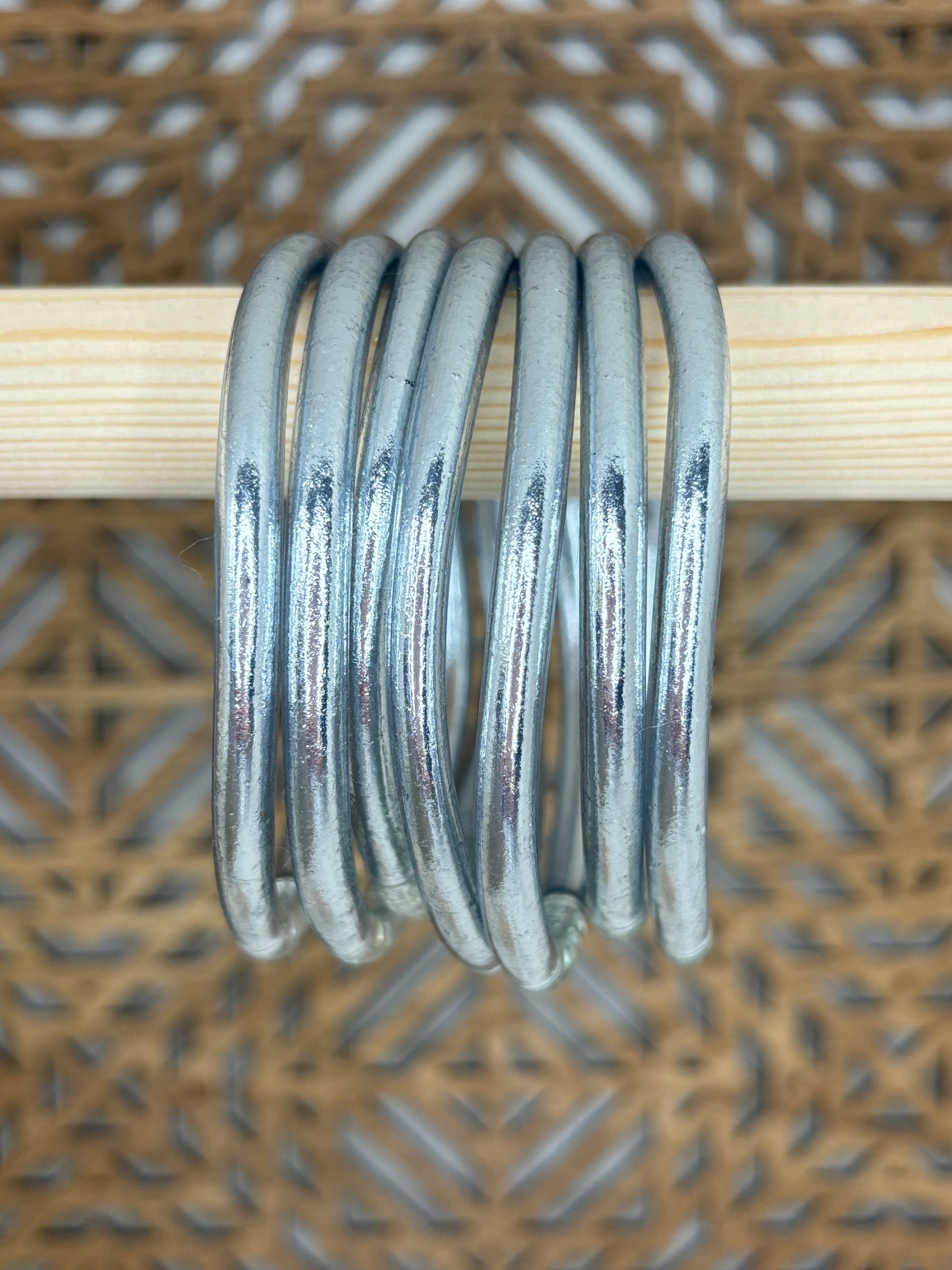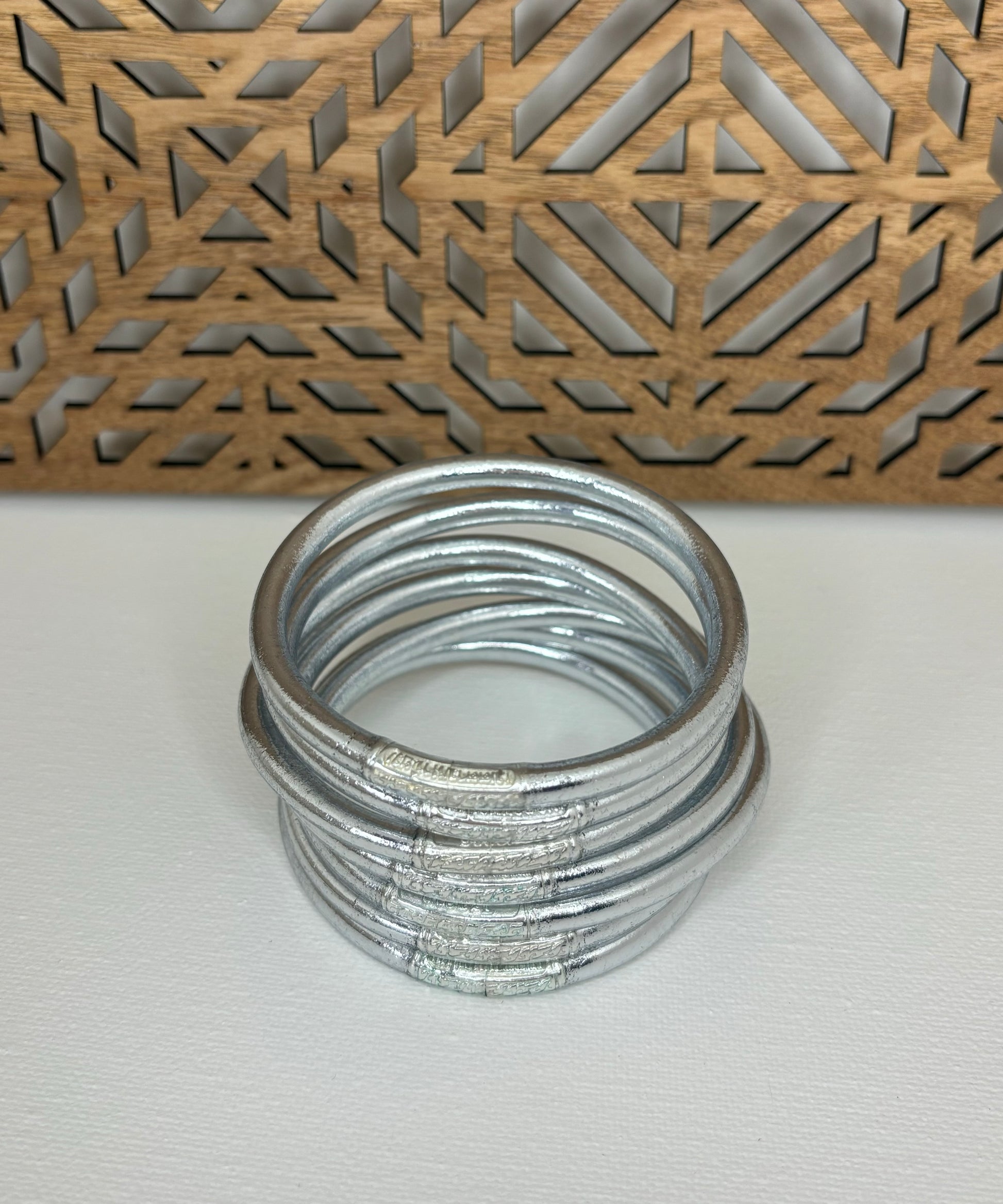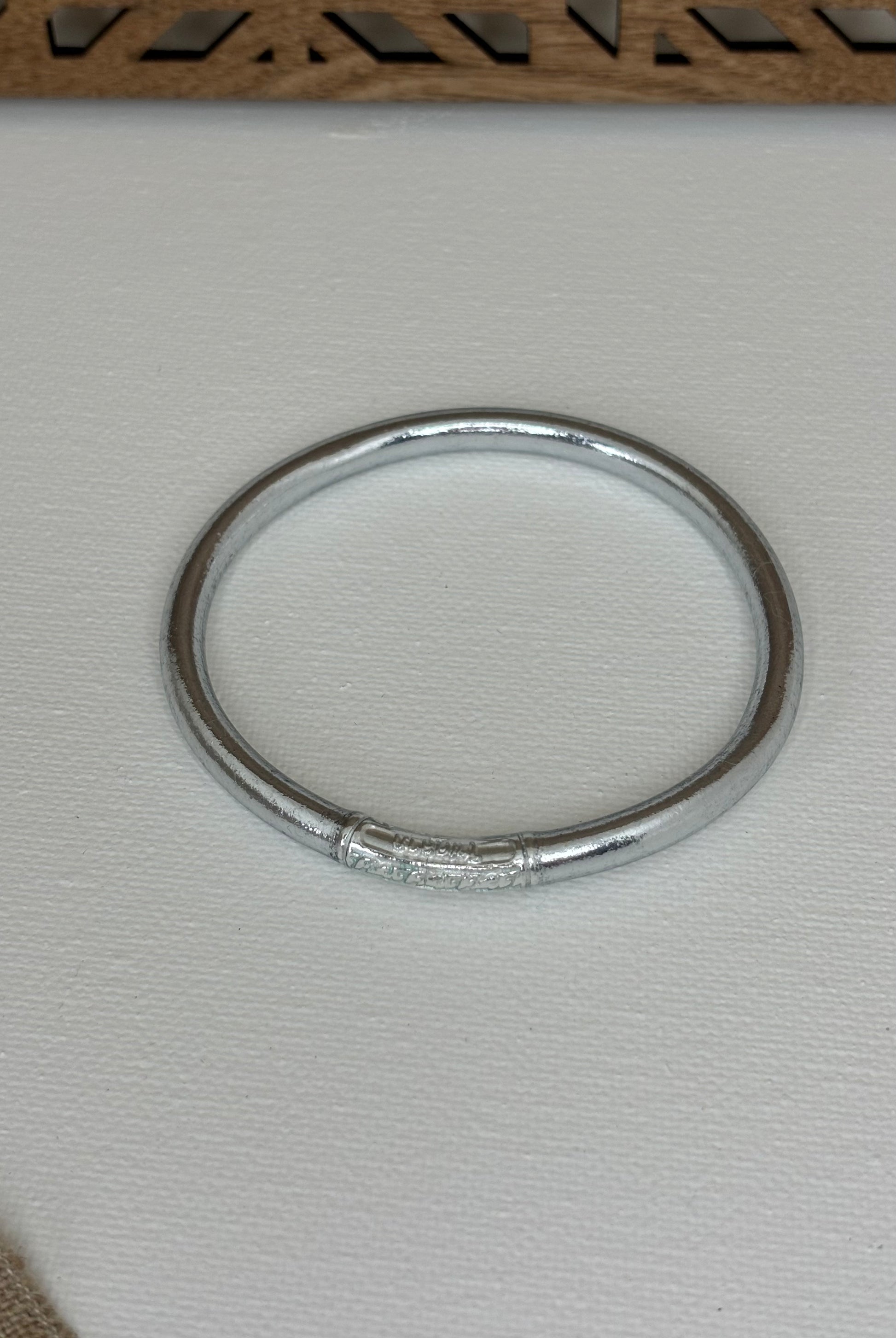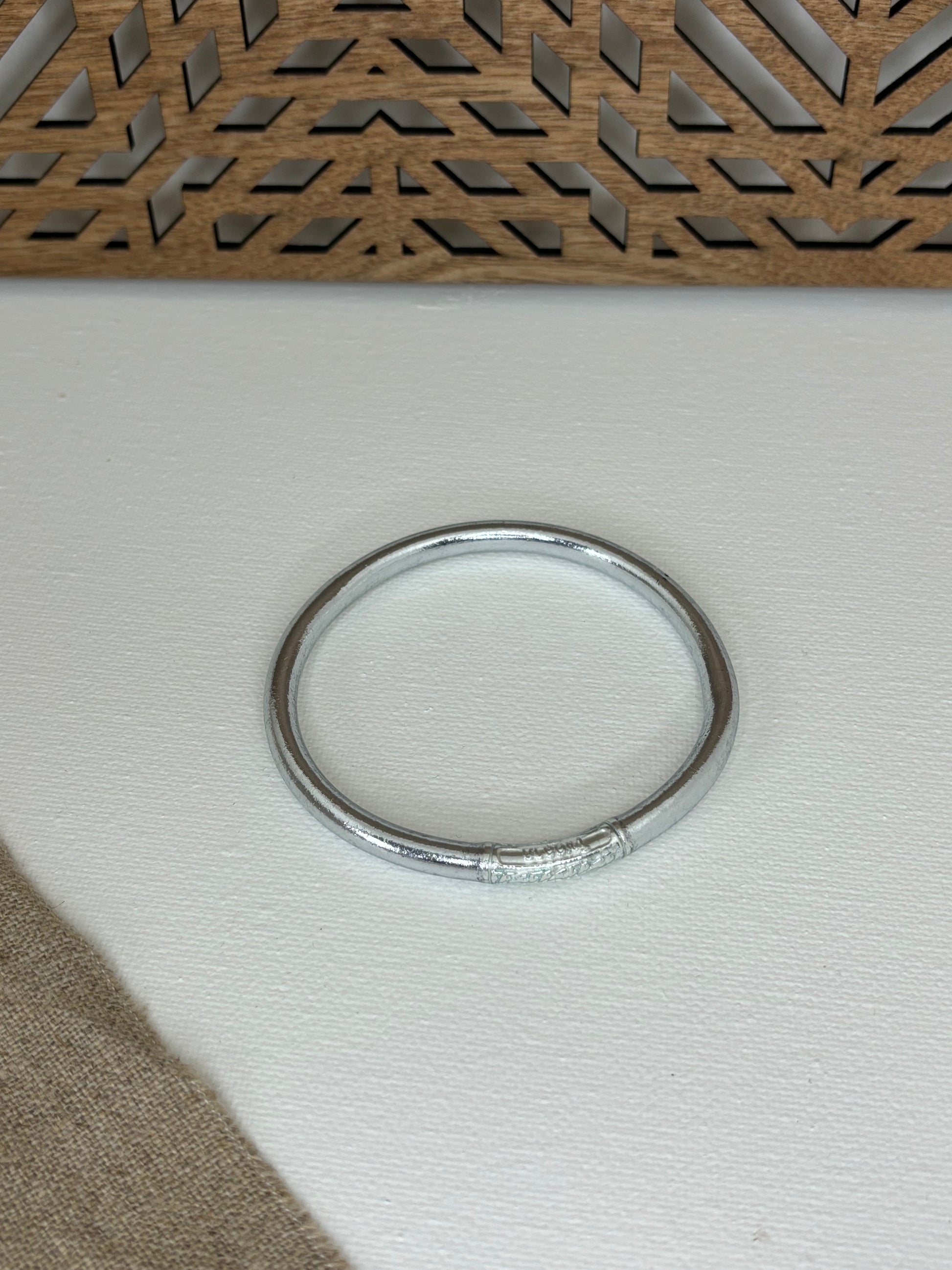 Cet authentique jonc souple est en caoutchouc naturel, rempli de feuilles d'argent et d’une huile sacrée. Il est scellé grâce à un mantra porte-bonheur en laiton gravé en Thaï : เมตตา โชค ด (chance et bienveillance).