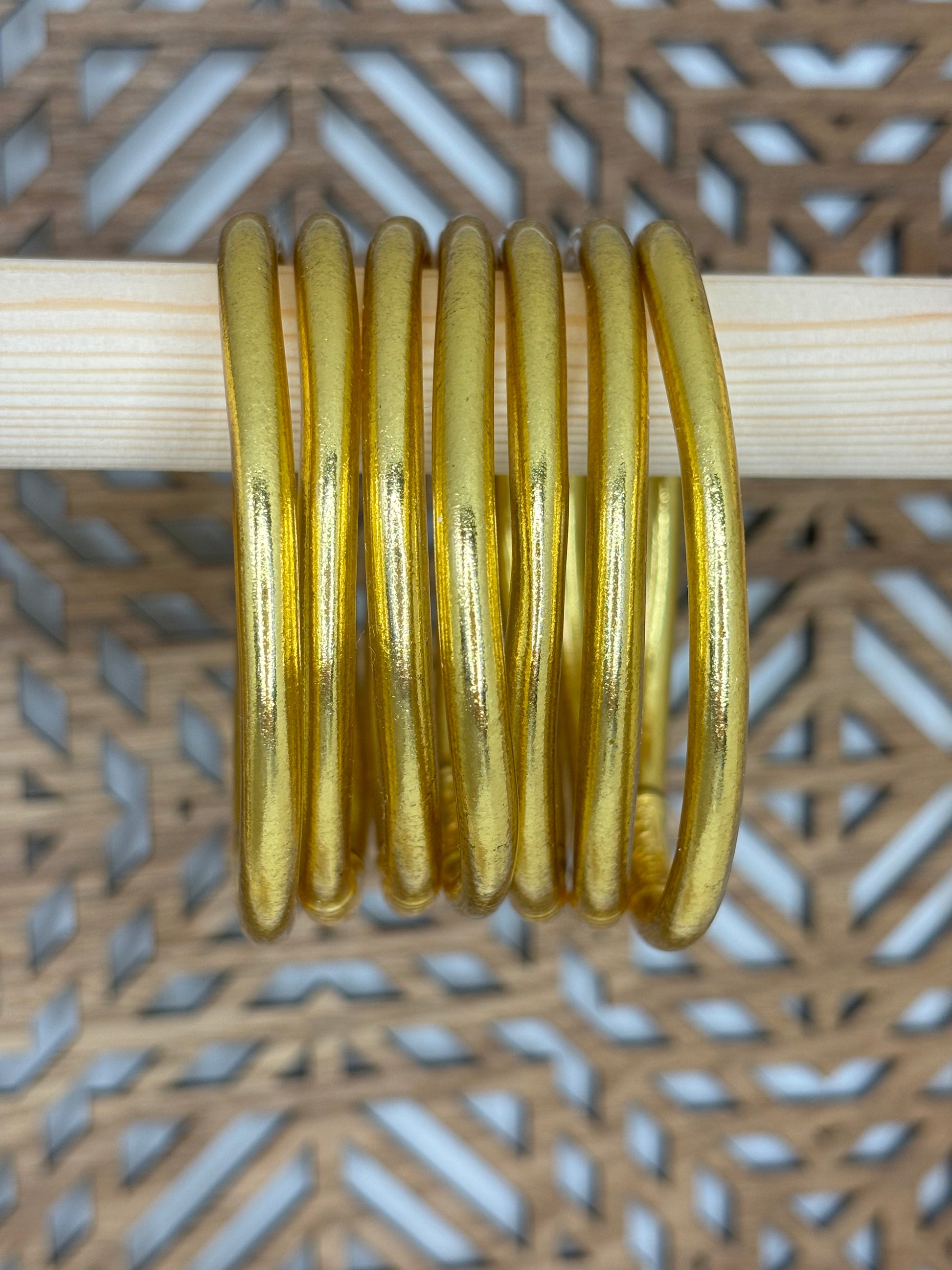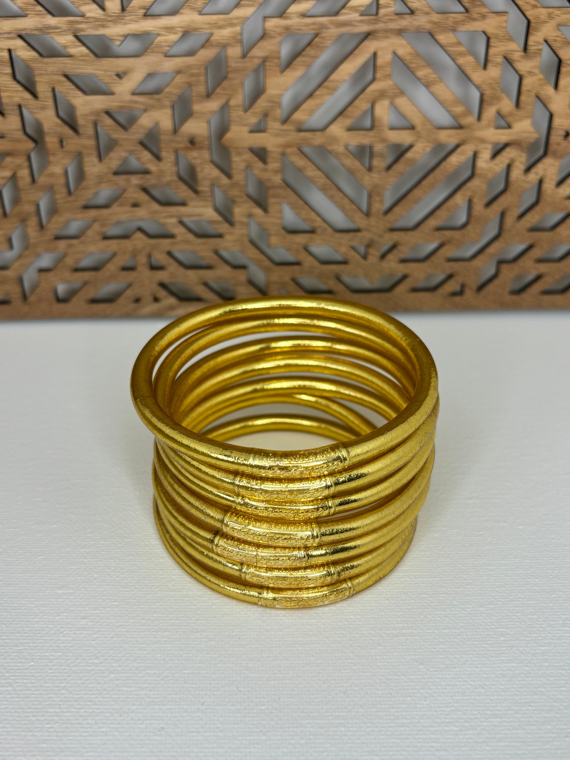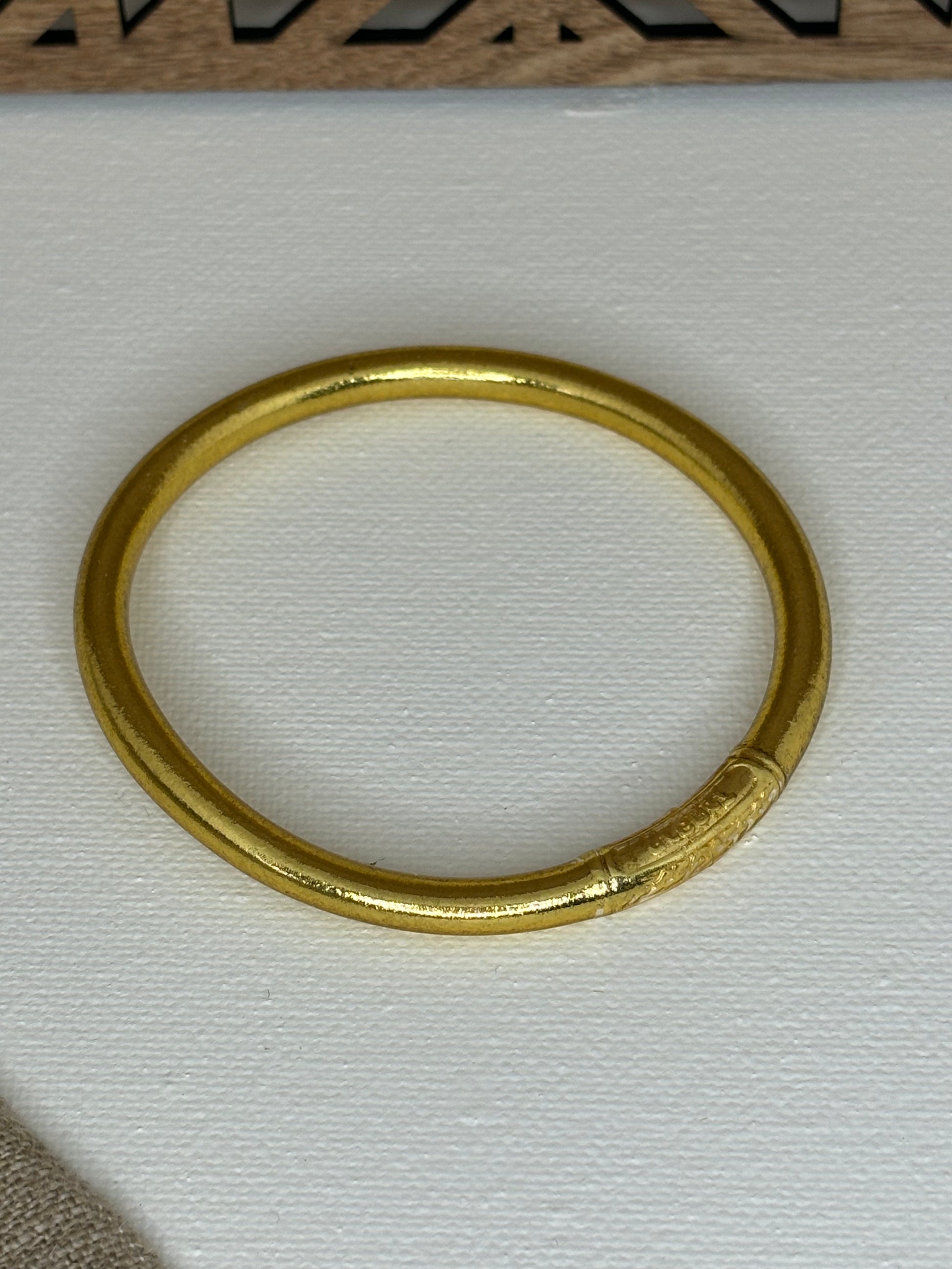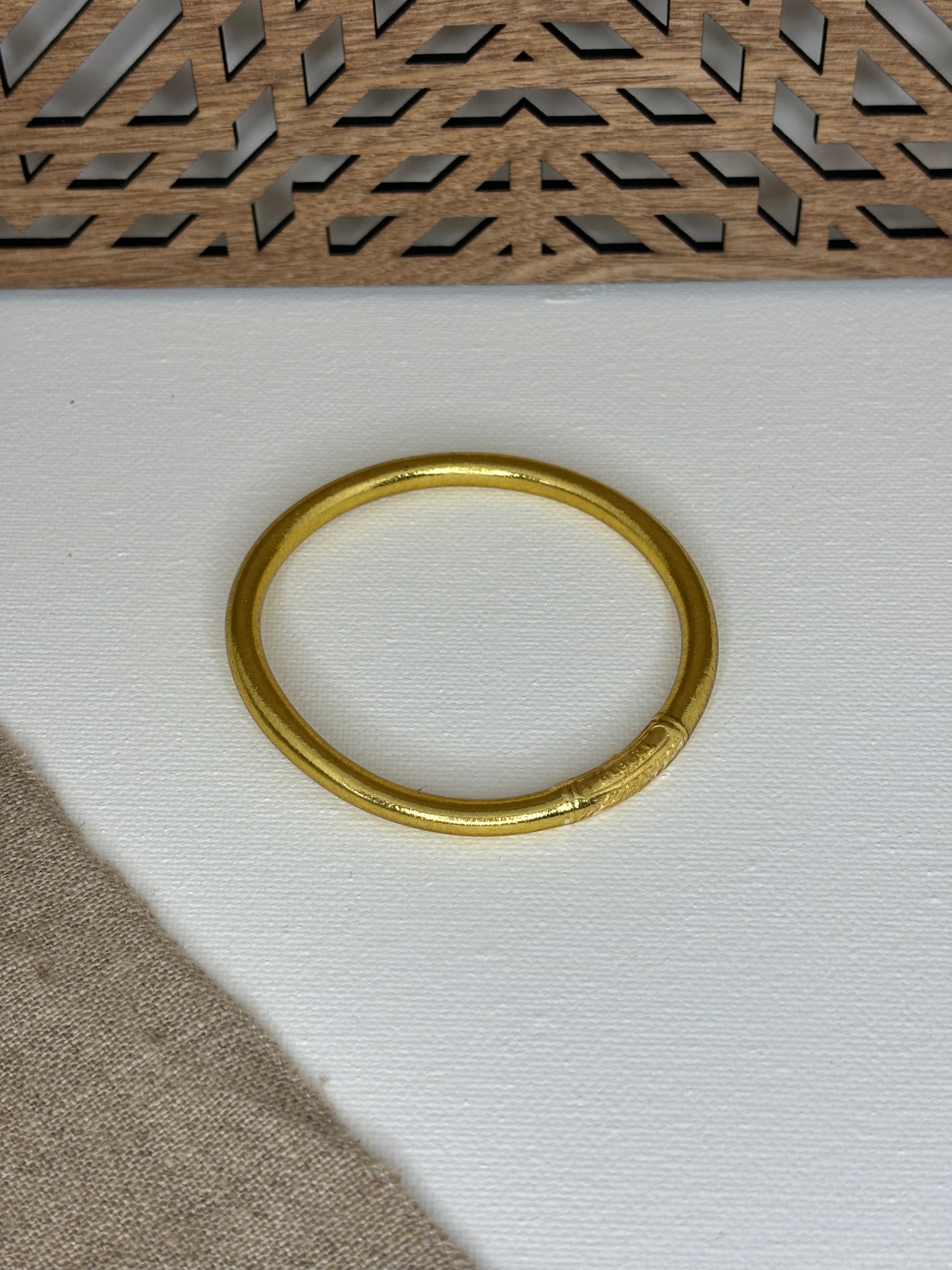 Cet authentique jonc souple est en caoutchouc naturel, rempli de feuilles d'or et d’une huile sacrée. Il est scellé grâce à un mantra porte-bonheur en laiton gravé en Thaï : เมตตา โชค ด (chance et bienveillance).